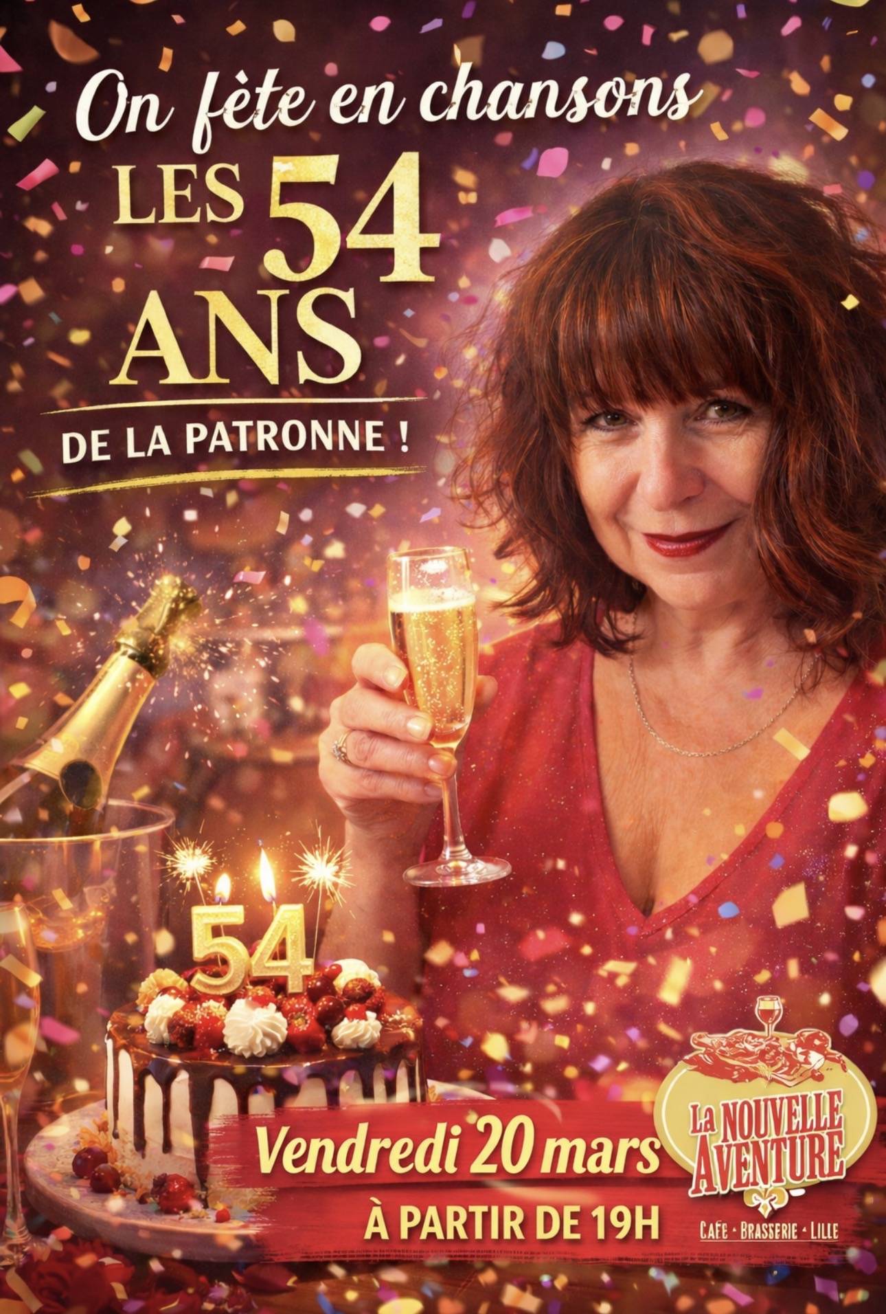 Le 20 mars, nous vous invitons à partager une soirée exceptionnelle à l’occasion des 54 ans de La Patronne de La Nouvelle Aventure.